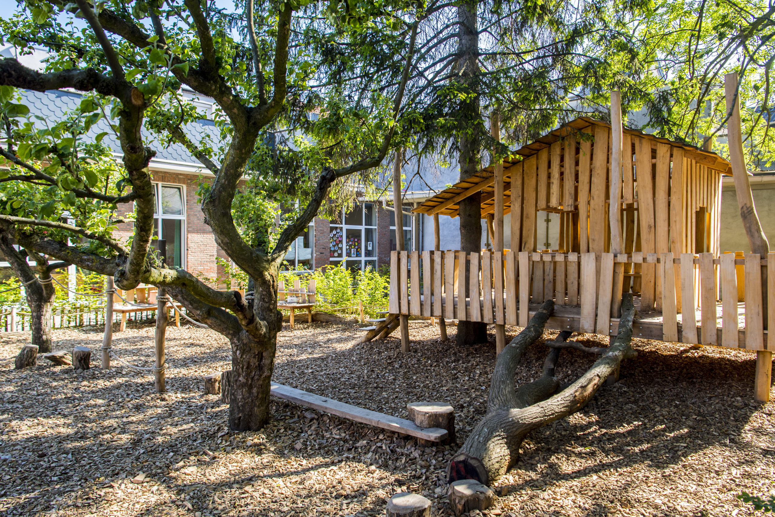 A climate-resilient school installs a natural playground, green roof, and/or facade garden, focusing on nature and water. This encourages students to engage with nature and makes the environment resilient to the effects of climate change, such as heavy rainfall, heat, and drought.